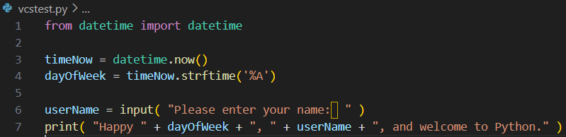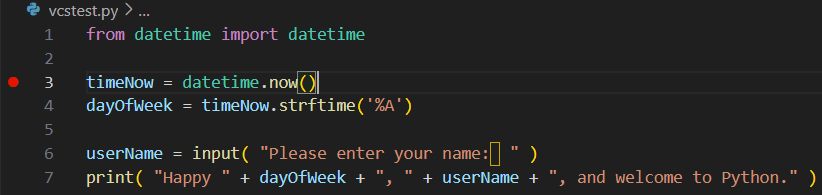 Here we have timeNow being set to the value generated by datetime.now(). Then, dayOfWeek is set to the string-formatted value from this internal timeNow. Running the script should produce the same output as before; it’s what’s happening inside that we’ll be looking at next.