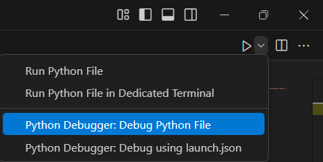 To start the debugger in VSC, click the pull-down next to the run icon, and choose Python Debugger: Debug Python File: