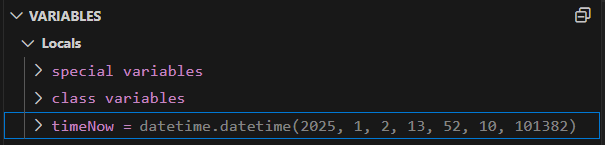 Use the Python Debugger: Debug Python File option to run it again, and the process should stop at this timeNow line: