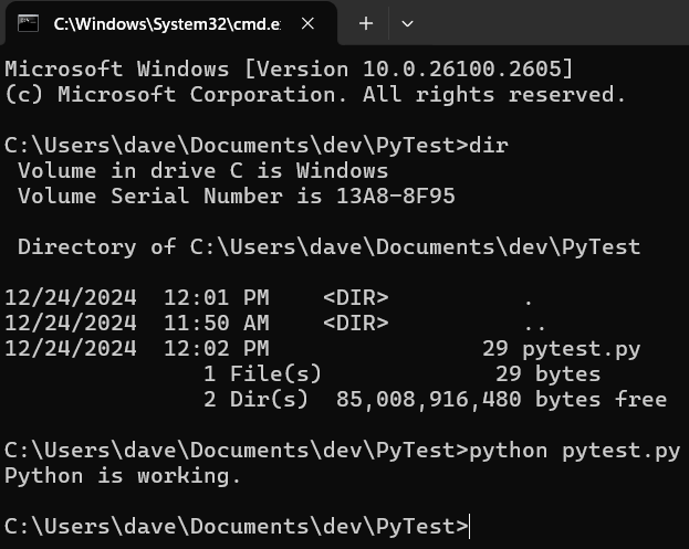 The quickest script in most languages to write is something that will put out a text message. Most use “Hello, World,” but let’s be reasonable and professional with something more useful, such as just “Python is working.”