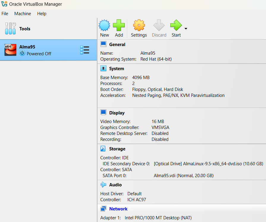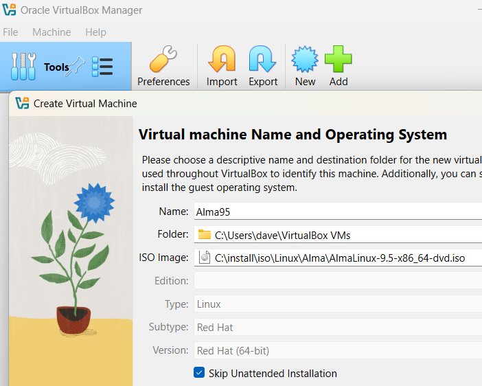 Within VirtualBox (VB), click the New button, then provide a VM name (using Alma95 might be helpful, since it’s going to be built upon AlmaLinux version 9.5), find the ISO that was just downloaded, and finally check the box to Skip Unattended Installation.