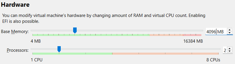 In the Hardware options, since we’re just installing a server, 4GB (or 4096MB) is appropriate (when doing a GUI install, 8GB might be better). Likewise, using 2 virtual CPUs is good for a server (GUI might need 4). Click Next.