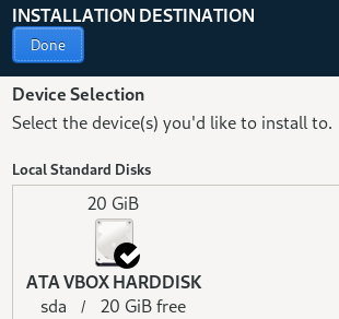Back in the Summary page, under System, click Installation Destination. In this case, the installer’s just confirming we want to use the default disk. It should be showing the 20GB HD selected during the VM configuration. Make sure it’s checked, and click Done.