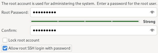 Click Root Password. Enter something easily remembered in the Root Password field. Then, repeat in the Confirm field. As soon as something’s entered in these fields, the Lock root account should uncheck itself (if not, uncheck it manually). Since we’re doing simple, local development with this VM, it’s OK to Allow root SSH login with password. (In a production environment, this would be left unchecked.)