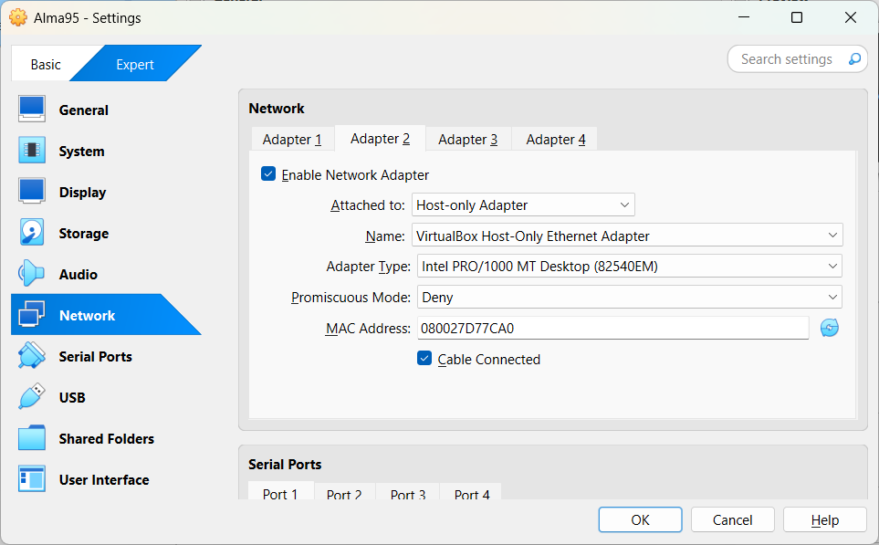 A Settings window should appear. Click Expert (if not already active). Click the Adapter 2 tab. Check the box for Enable Network Adapter, which should activate the sub-settings. Change Attached to to Host-only Adapter. Make sure Cable Connected is checked.