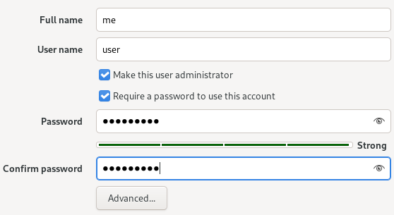 Check the box next to Make this user administrator (this will allow you to log in with the user account, then request root access without having to log out and back in again as root. Make sure Require a password to use this account is also checked.