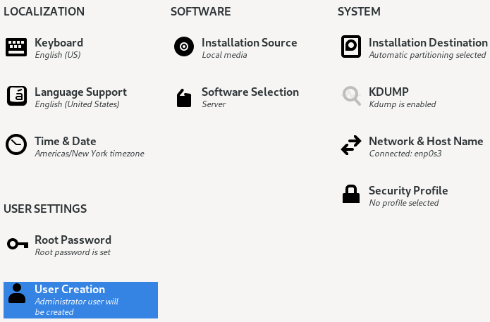 The last thing to set is under User Settings. We’ll need at least the Root Password set, but it might also be a good habit to get into to go through User Creation. The “root” is the administrator of the system — the account that can do anything. The user should be restricted, kept from messing around with the system.