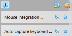 The Mouse integration … notification is referring to the issue that you’ll likely need to click once on the VM window to activate the mouse cursor capture by the OS running in that VM. Click the bubble icon with the slash (showing here to the left of the blue x).