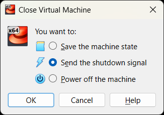 After the system boots again, and before we get into setting up integration between the Windows host system and this AlmaLinux VM, let’s first set up the hypervisor to send a shutdown signal when the VM terminal is closed. This can be done by clicking the close the window in which the terminal is visible. In the Close Virtual Machine prompt that appears, click Send the shutdown signal.
